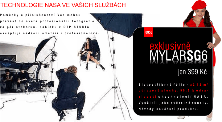 Digitální fotoaparát má dnes každý, ale dokáže každý využít všech možností, které digitální fotografie nabízí? I když fotografie prošla za poslední léta velkými změnami, zásady tradičního řemesla zde zůstaly.  Jedním z nejdůležitějších atributů je samozřejmě stále světlo. Digitální fotografie trpí u nedostatečně osvětlených snímků velkým šumem. Pro zlepšení světlených podmínek DTP STUDIO připravilo produkt MYLAR SG6 v několika verzích. Jde o odrazovou folii, která pomáhá nasměrovat světlo kam potřebujete, případně ho rovnoměrně rozptylovat. Více ZDE
