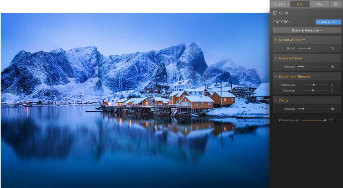 • Úpravy oblohy. Unikátní algoritmy využívají umělé inteligence tak, aby nebe na fotografiích vypadalo přirozeně.