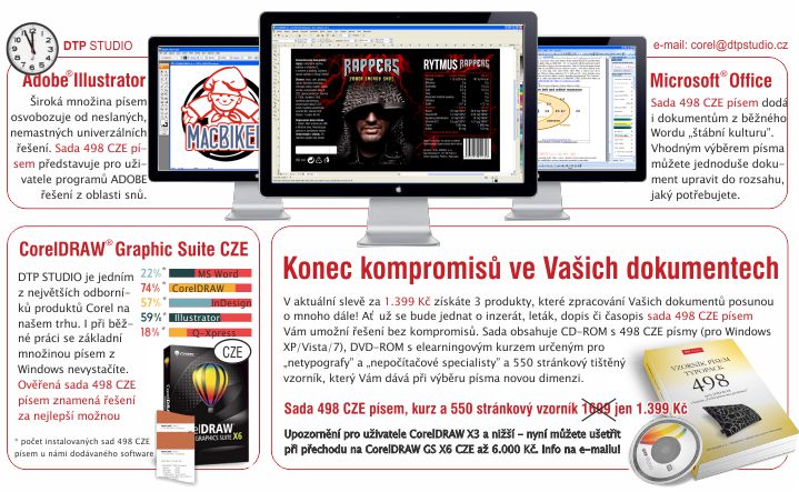 Pokud ano, dejte nám vědět(corel(zavináč)dtpstudio(tečka)cz). Jsme tu pro Vás! Nechcete-li mít v budoucnu obdobné problémy používejte sady písem aktuálně dodávaných DTP STUDIEM - 498 CZE množiny info ZDE, přehled písem ZDE, eshop ZDE (akční cena!!!) nebo 700 CZE písem info ZDE, přehled písem ZDE, eshop ZDE. Investice za pár tisíc se Vám, jak vidíte, určitě vyplatí.