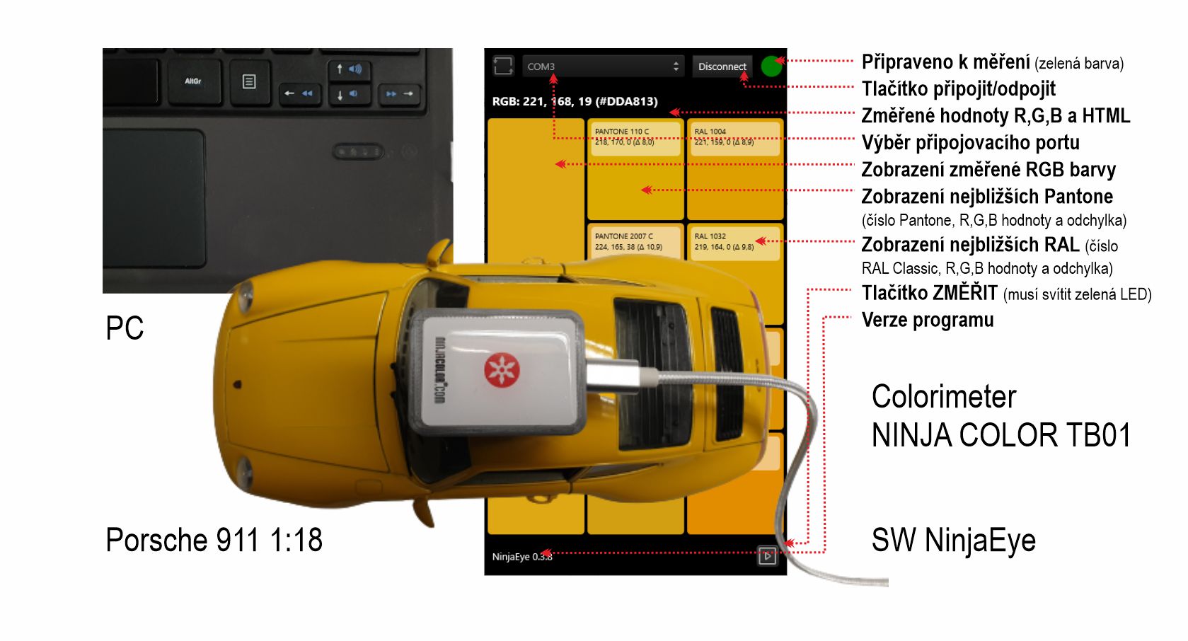 Po instalaci ovladače do počítače spusťte program NINJA COLOR® EYE (1), všimněte si červené signalizace vedle tlačítka CONNECT. Vybere symbolem šipka nahoru/dolu odpovídající port připojení (v tomto případě COM3) a klikněte na tlačítko CONNECT (2). Je-li vše v pořádku, signalizace se rozsvítí zeleně (3) a vy můžete měřit barvy.