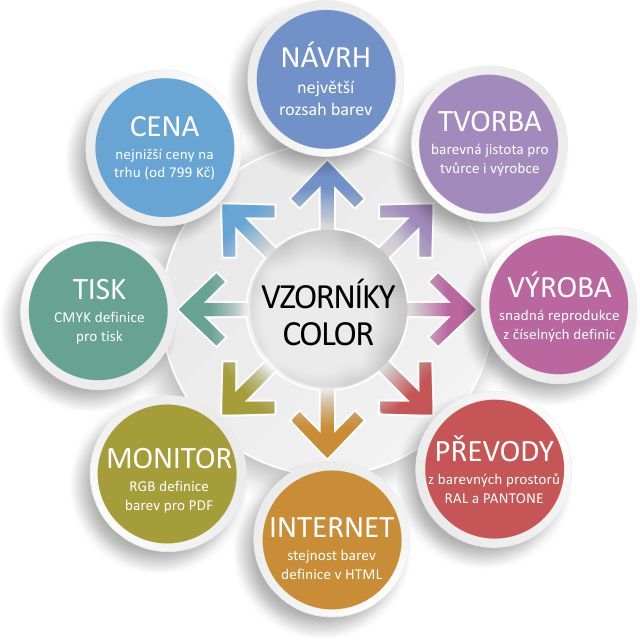 Barva je důležitým nositelem informace, zvyšuje pozornost a pomáhá v orientaci. Pro zvládnutí bezproblémové tvorby a výroby barevných produktů, a při práci s barvou obecně, potřebujete barevný vzorník. Na trhu jich je celá řada, od výrobců barev, přes vzorníky v grafických editorech, až po speciální systémy. Vzorníky pro digitální a sublimační barevný tisk se jmenují COLOR CMYK. Kliknutím na obrázek konkrétního typu dostanete více informací.
